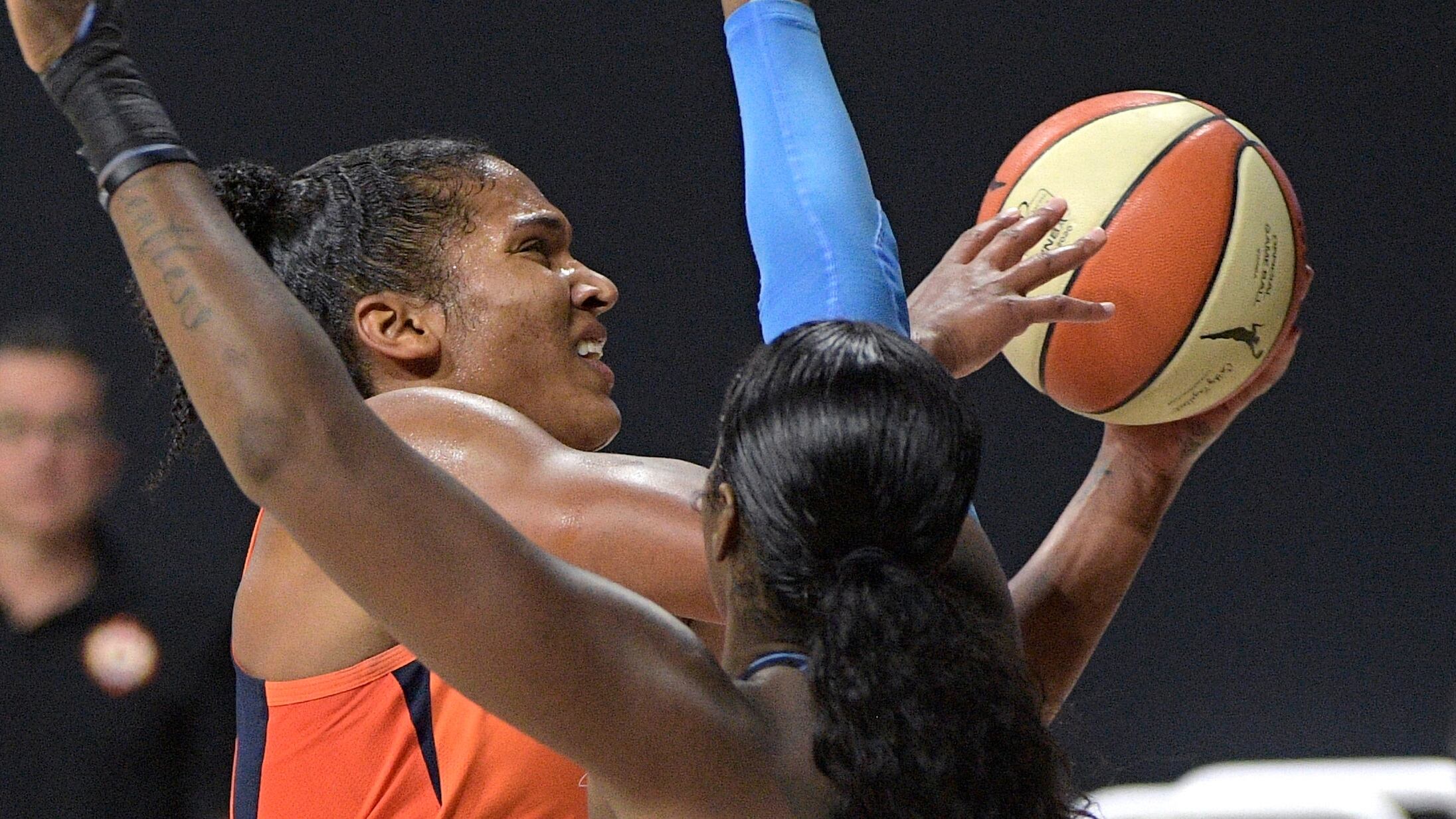 Connecticut Sun forward DeWanna Bonner (24) drives to the basket in front of Chicago Sky guard Kahleah Copper during the second half of Tuesday's playoff game.
