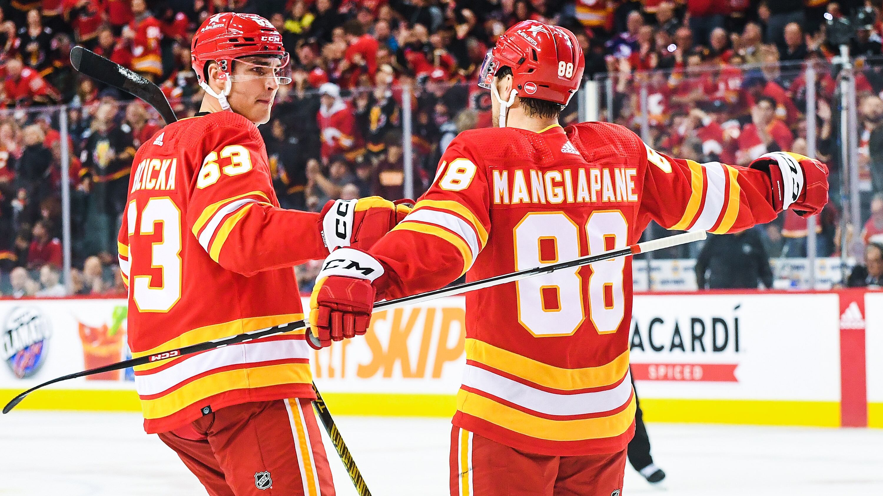 CALGARY — Andrew Mangiapane scored twice and had an assist for the Calgary Flames in a 5-3 win over the visiting Winnipeg Jets in the NHL regular-season opener for both clubs Wednesday.