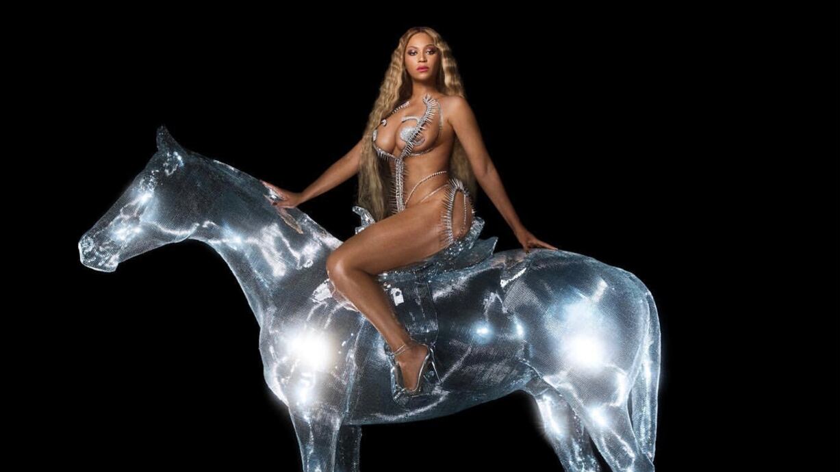 The regal image shows Beyoncé in barely-there attire, mounted atop a glowing, translucent horse.