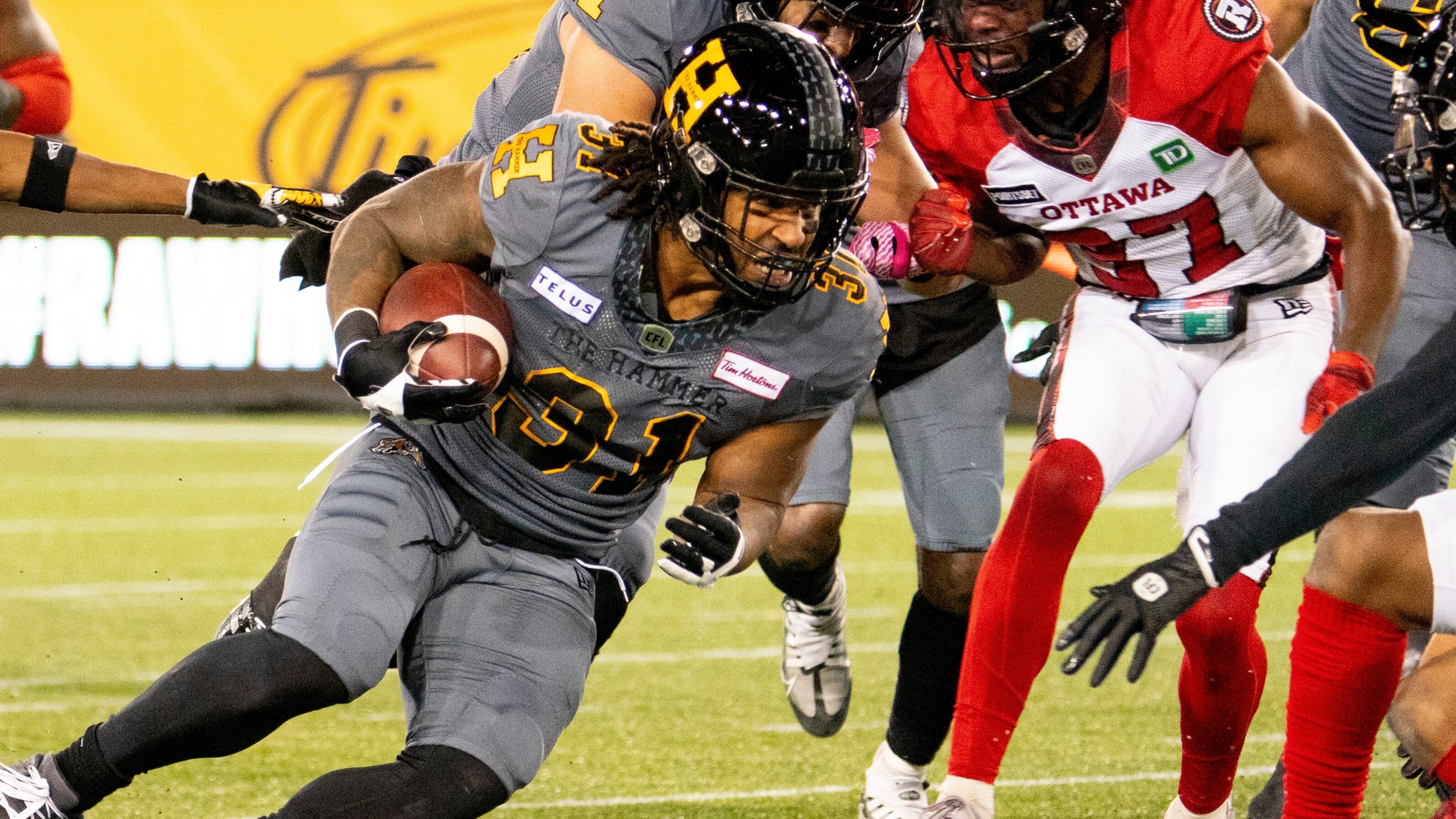 Thomas Erlington rushed for a season-high 104 yards in Hamilton's 30-27 victory over Ottawa. It was the running back's second career 100-plus rushing yard game. He averaged eight yards per carry, and had two 20-plus yard carries.