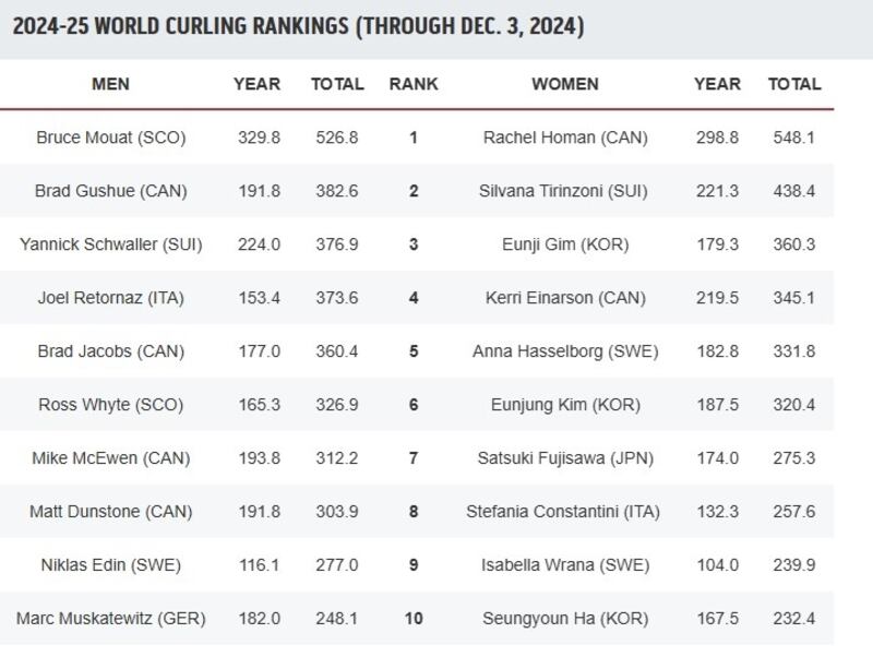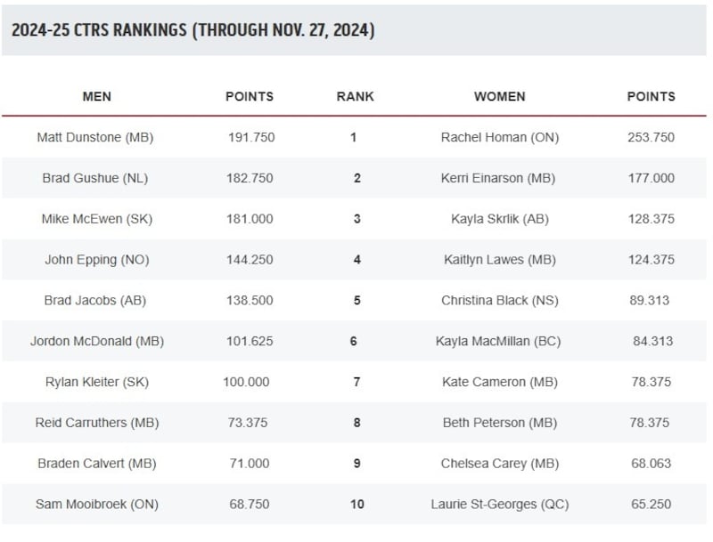 As for the Canadian Team Ranking System, Homan leads the way, followed by Einarson, Team Kayla Skrlik, Team Kaitlyn Lawes and Team Christina Black to round out the top five.