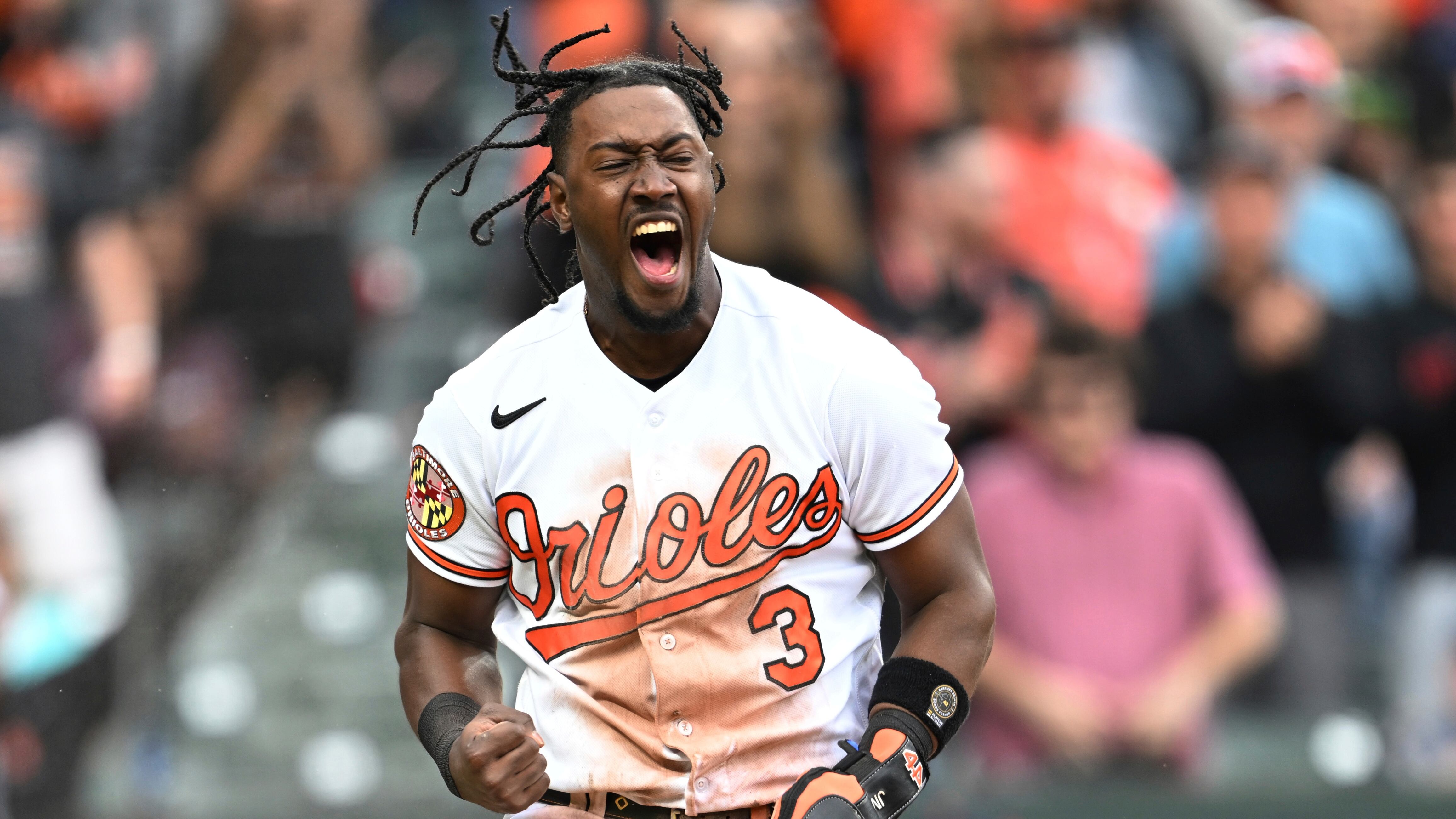 Hernández made a diving stop behind second base on Cedric Mullins' grounder in the seventh, but when he tried to roll into his throw in one motion, the toss hit second base umpire Manny Gonzalez as he was trying to get out of the way.