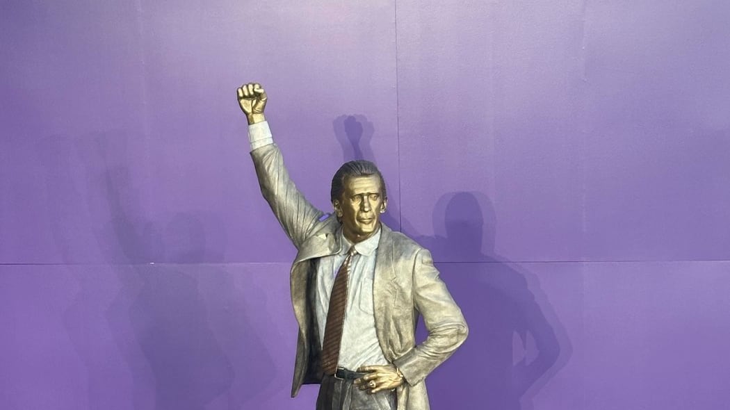 The statue, depicting Riley holding up his right fist high in the air -- the "Showtime" Lakers' signal to have Magic Johnson pass the ball to Kareem Abdul-Jabbar for his signature skyhook throughout the 1980s -- immortalized his fashion sense with the coach in not only an Armani suit, but also a crocodile leather belt.