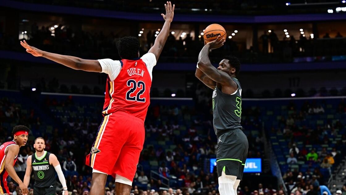 The Pelicans scored the first point of the fourth quarter for a 91-88 lead. The Wolves then scored 15 straight for a 103-91 lead and held on from there.