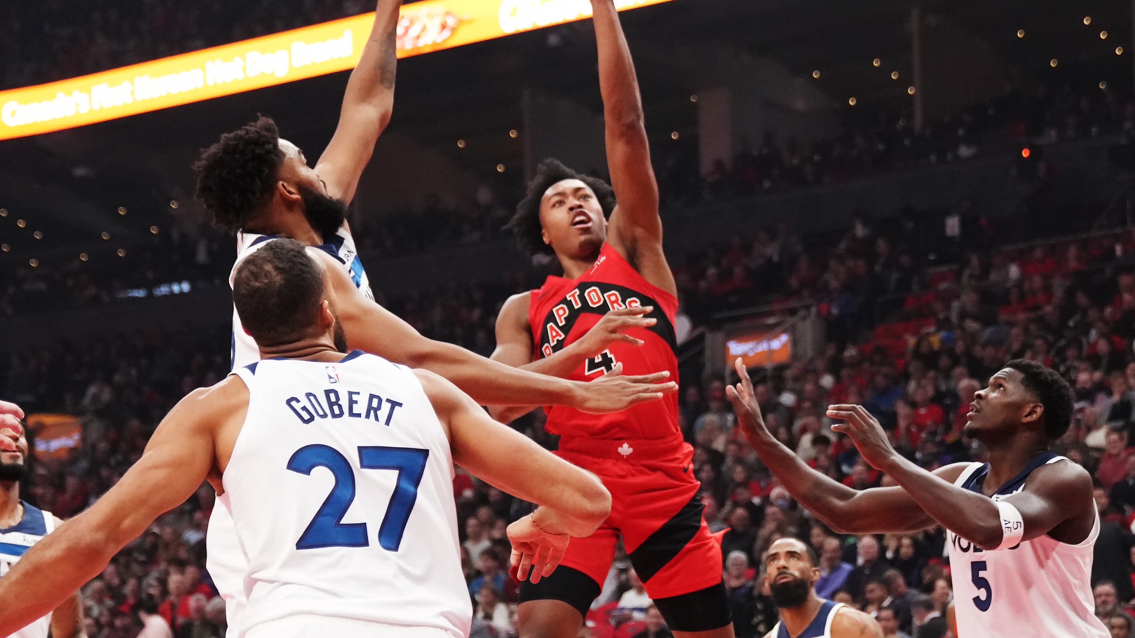 The Toronto Raptors lead the Minnesota Timberwolves 53-51 heading into halftime of their season opener at Scotiabank Arena on Wednesday night.