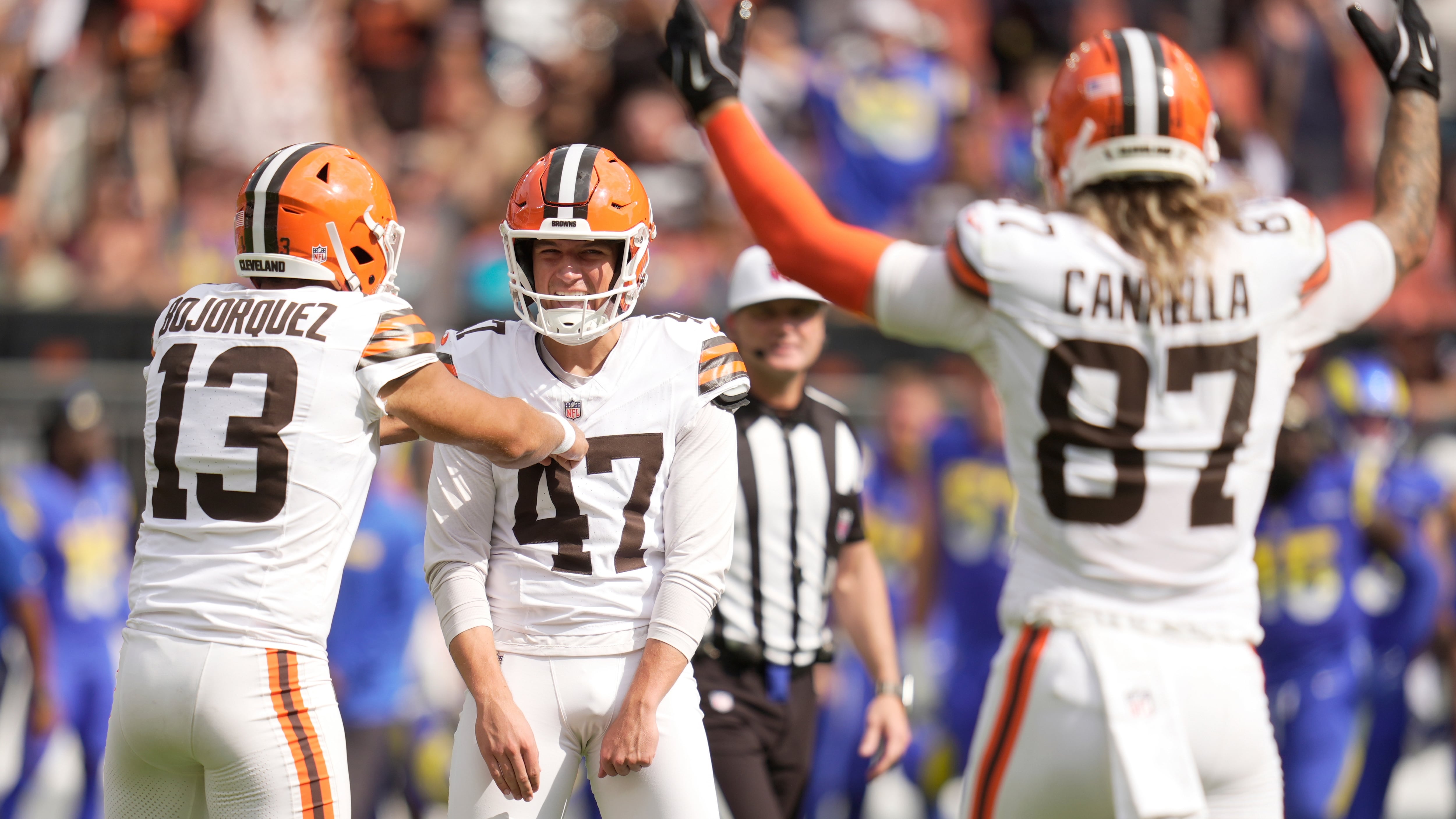 With Huntley behind center, Cleveland (3-0) drove into position for Andre Szmyt’s 37-yard field goal as time expired in a 19-17 victory over the Los Angeles Rams.