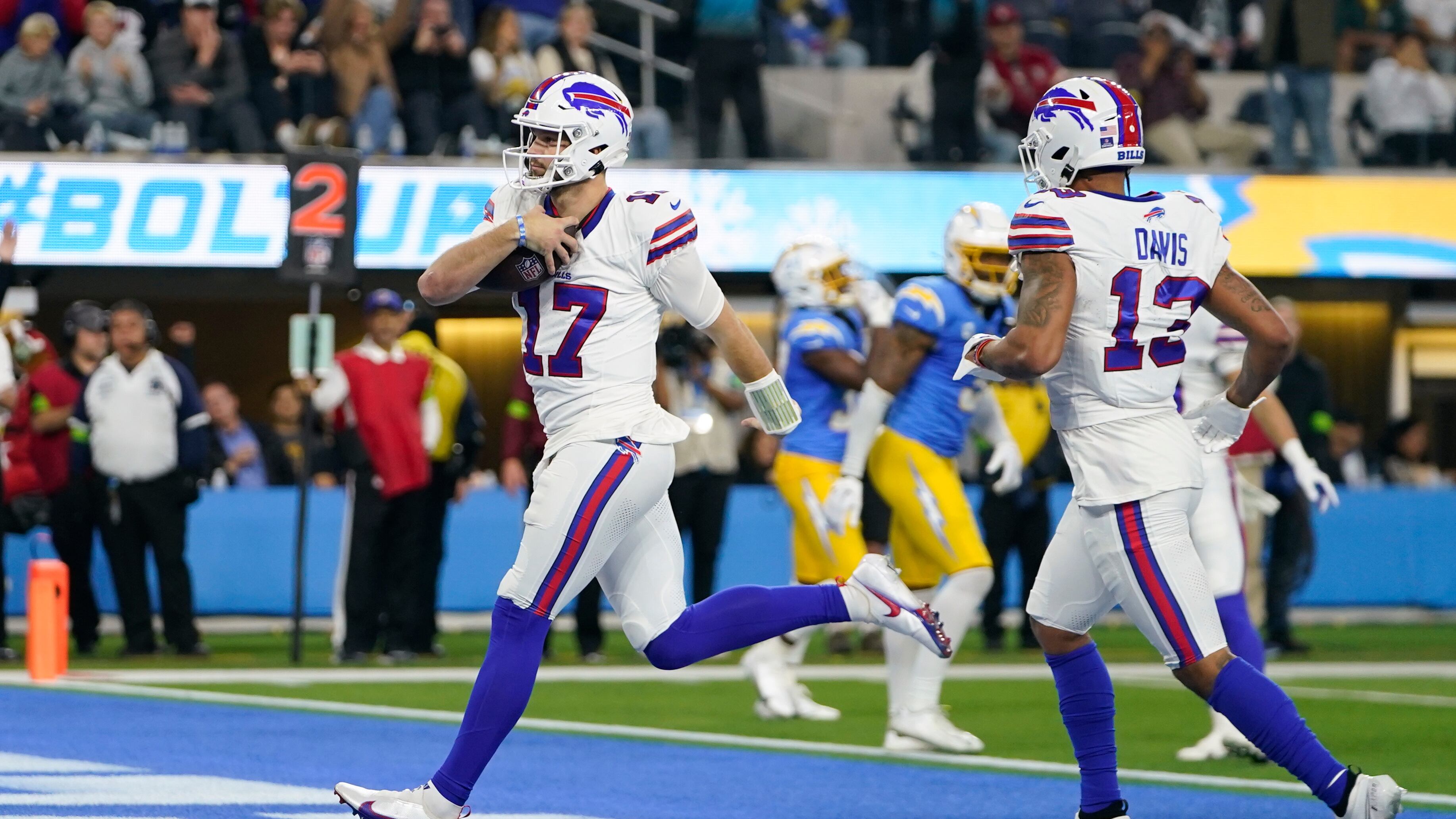 Allen scrambled right and found Davis open downfield. Davis hauled in the pass at the Chargers 19 and beat linebacker Kenneth Murray into the end zone. It was Allen’s second-longest completion of the season.
