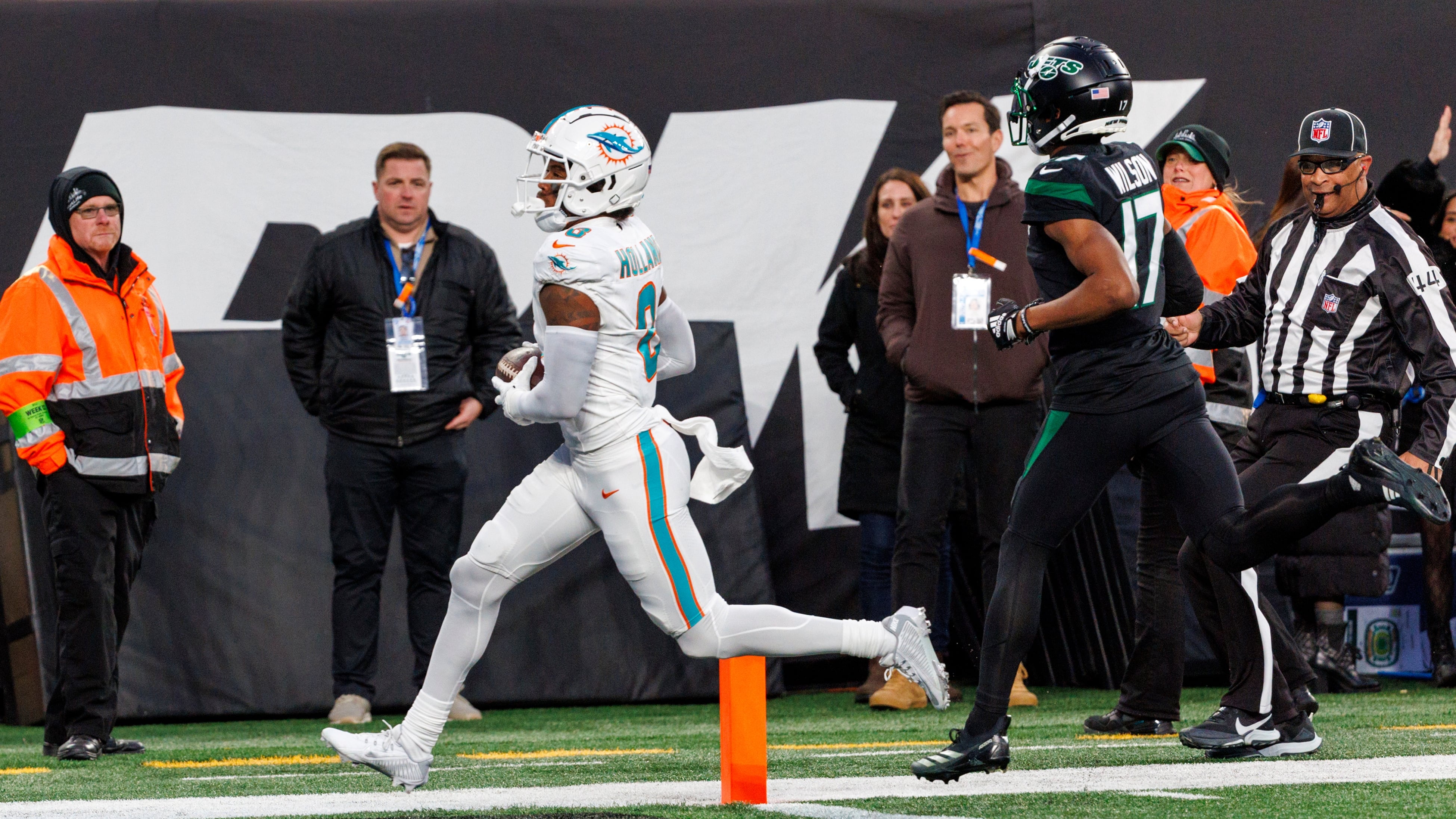 Coquitlam, B.C., native Jevon Holland picked off New York Jets quarterback Tim Boyle on a Hail Mary attempt and went 99 yards the other way for a pick-six in the Miami Dolphins' 34-13 win on Black Friday.