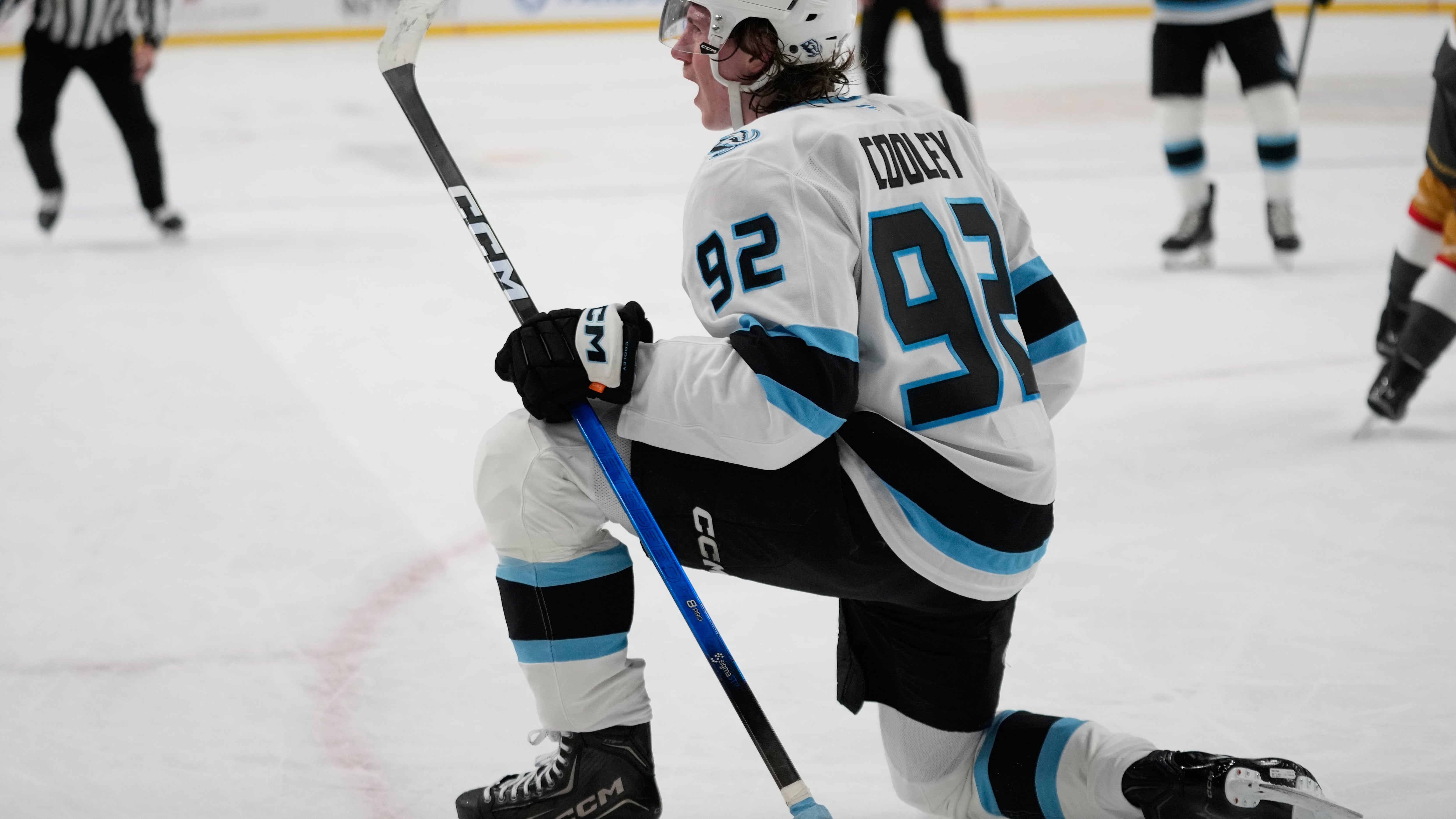 With the score tied at 2 in the waning minutes of regulation, Guenther took a shot off the rush, got his own rebound and then hit the puck off the post. Cooley was waiting there, knocking in the puck to pull the Mammoth even.