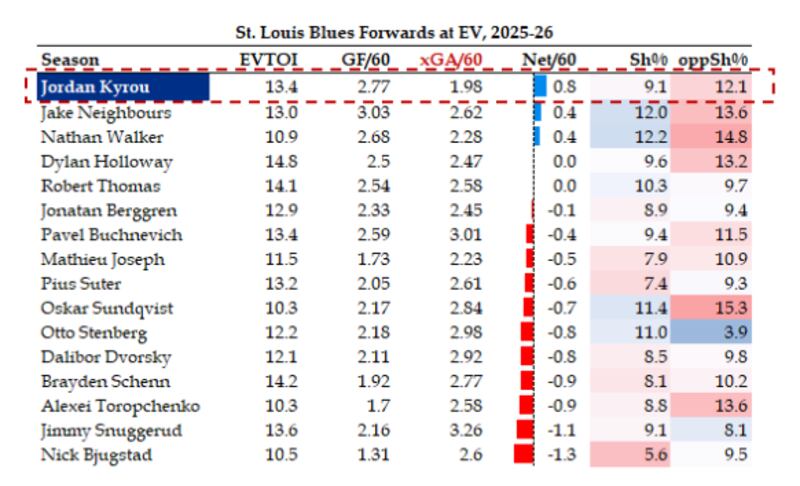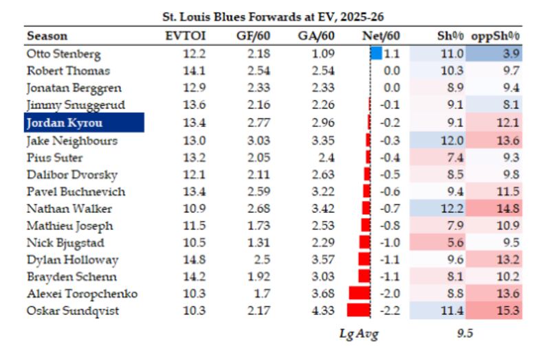 Kyrou has the fifth best on-ice goal differential for St. Louis this season, with the Blues outscored 31 to 29 (-2) with him deployed. That’s nothing to write home about, but noteworthy when your goaltenders aren’t even stopping 88 per cent of shots faced: