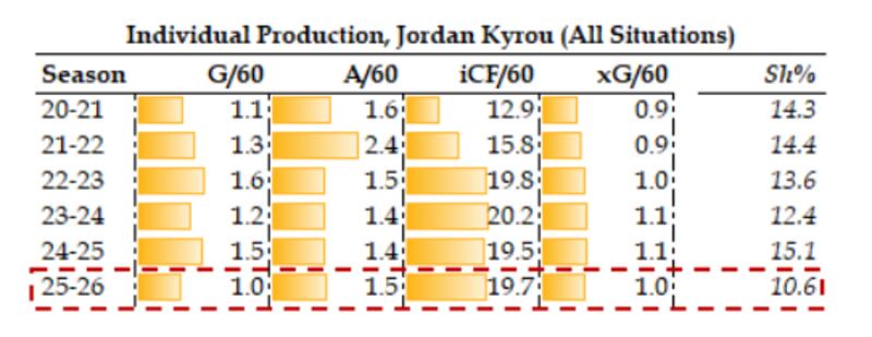 Considering the above (and the fact that goaltenders have reliably stopped 91 per cent of shots with Kyrou on the ice over his career), it’s reasonable to argue that defensively Kyrou has been burned by some rather unfavourable puck luck.