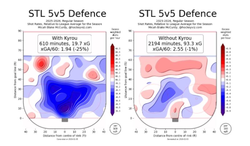 If you need any more evidence that Blues goaltenders are hurting Kyrou much more than his play is hurting them, consider the shot profiles faced at 5-on-5 with and without him deployed.