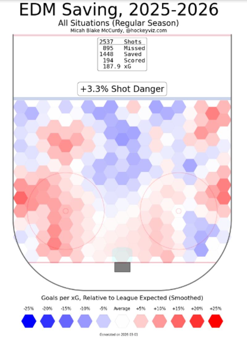 Relative to league averages, Edmonton goaltenders are all too forgiving (via HockeyViz):