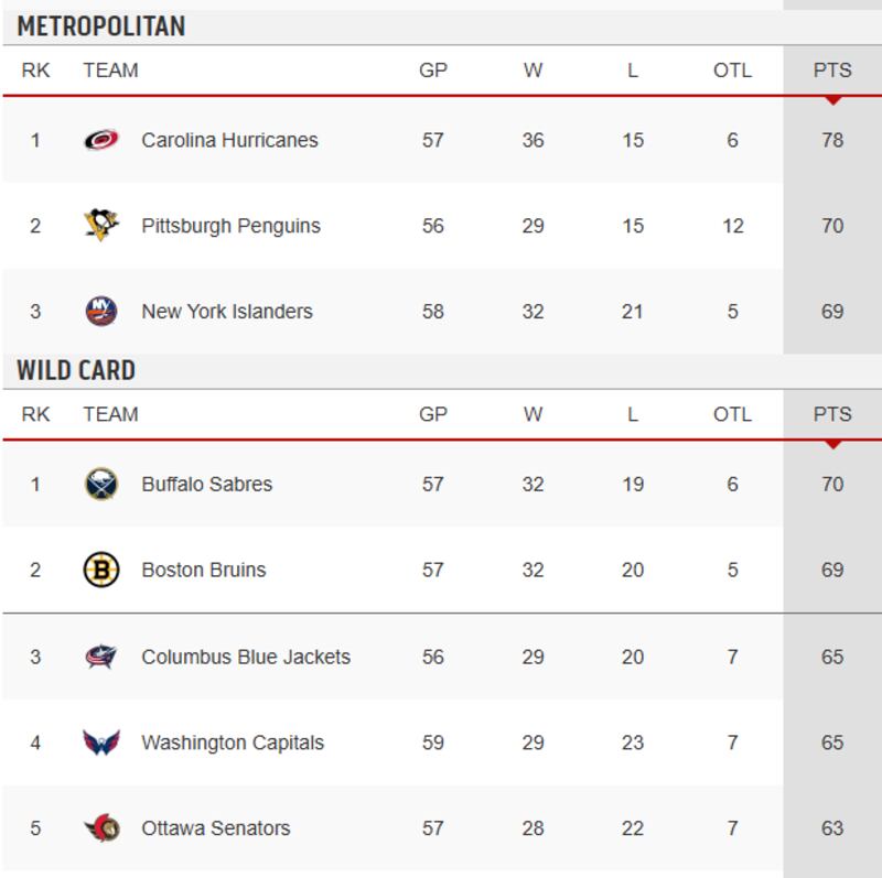 Pittsburgh is one point ahead of the New York Islanders for second in the Metropolitan Division and five points clear of the Blue Jackets, with the division race offering a more likely path into the dance than the crowded wild-card picture.
