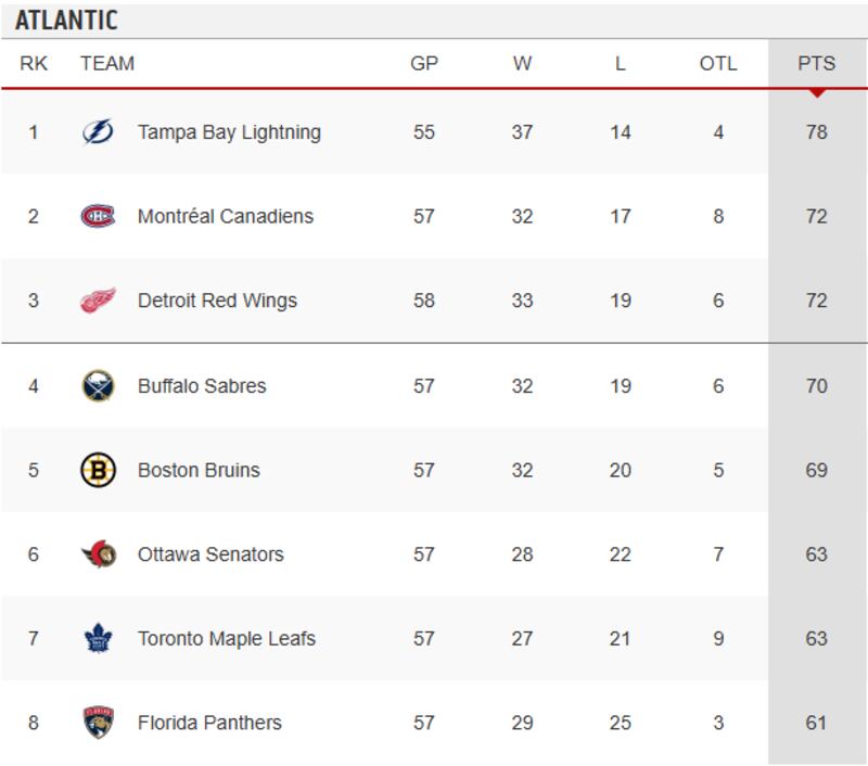 But Buffalo has gone 21-5-2 over their past 28 games to surge into top wild-card spot in the Eastern Conference. The Sabres sit five points ahead of the Blue Jackets, who are outside the playoff picture, and just two points back of both the Montreal Canadiens and Detroit Red Wings, who sit second and third in the Atlantic Division.