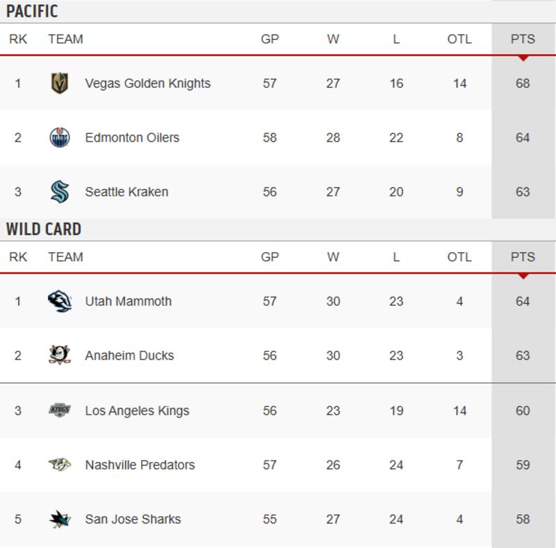 The Utah Mammoth currently sit in the top wild-card spot as the team looks to make the playoffs for the first time since relocating in 2024 and will be fighting it out with the Pacific teams in the wild-card race with the Colorado Avalanche, Minnesota Wild and Dallas Stars well ahead in the Central Division. The Nashville Predators are also part of the wild-card race, just four points back of the Ducks after an ugly start to their season.