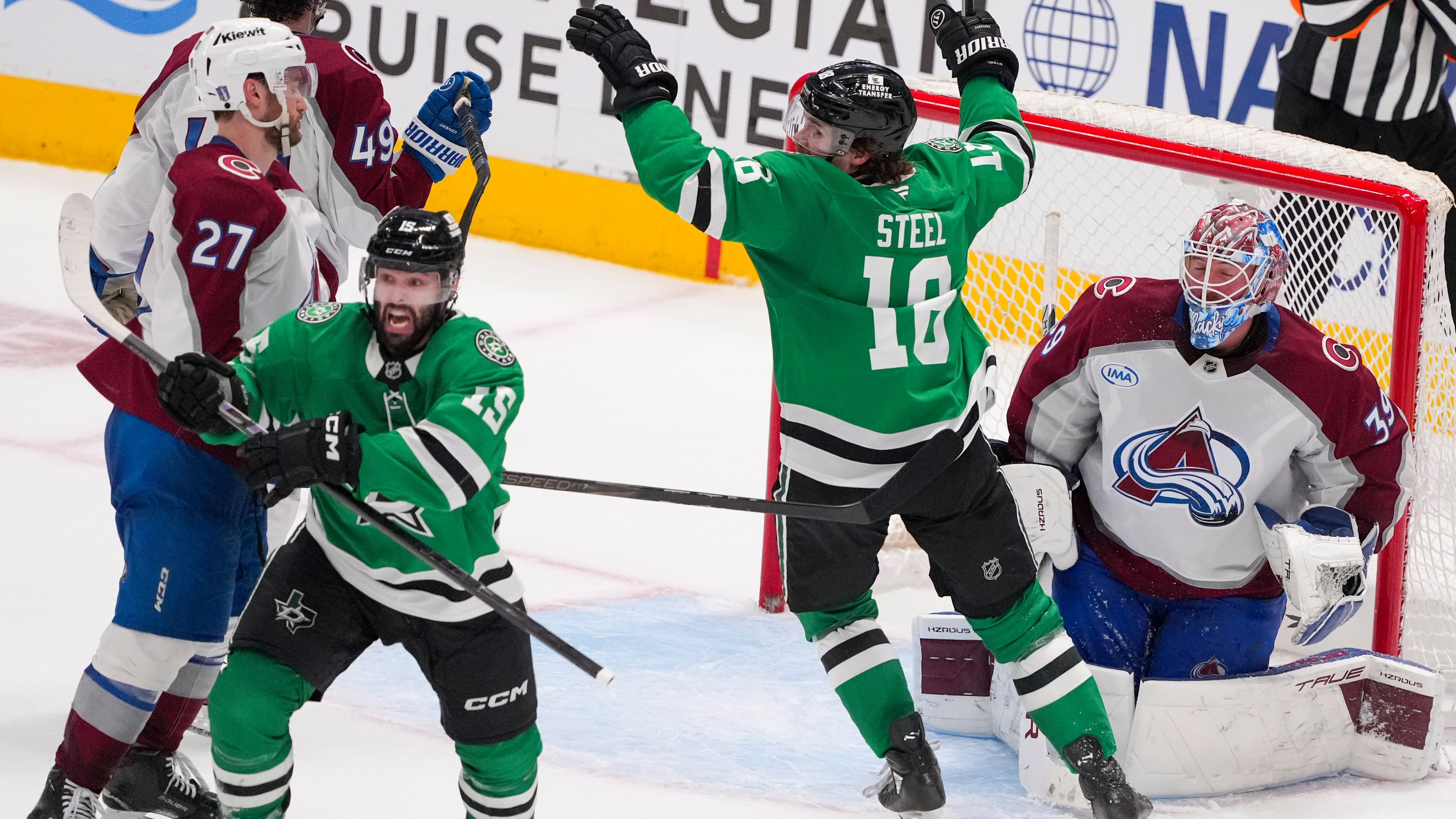 The Stars matched MacKinnon’s goal with a power play in the final minute of the first period. Captain Jamie Benn skated behind the net, passed to Marchment in the middle of the right circle before he pushed the puck across to Seguin in the opposite circle for the slap shot.