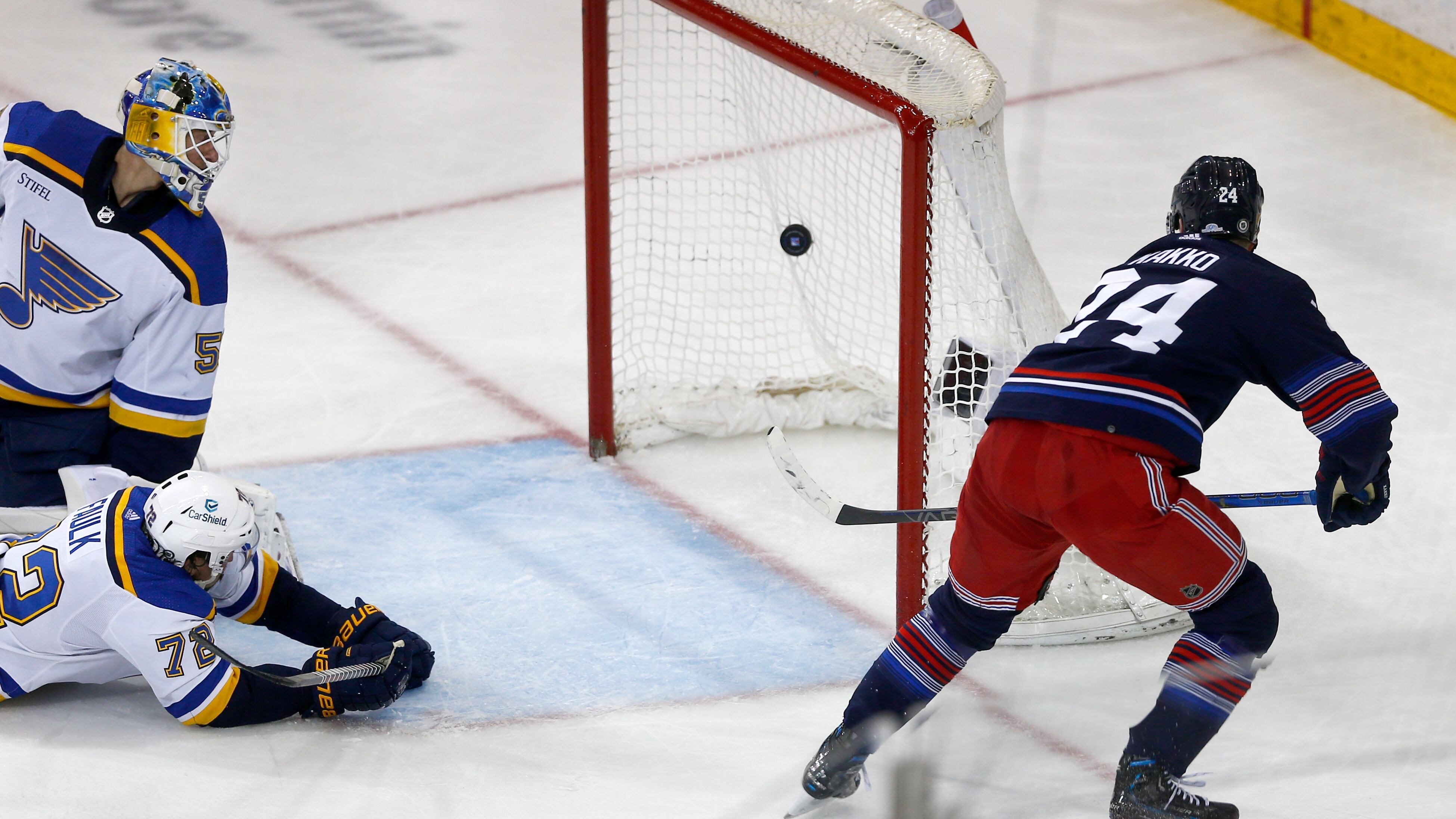 Shesterkin robbed St. Louis' Brandon Saad at 15:22 of the first on a tip-in try. He made a sprawling stop on Kasperi Kapanen midway through the second and another on Blues leading scorer Robert Thomas in the first minute of the third period.