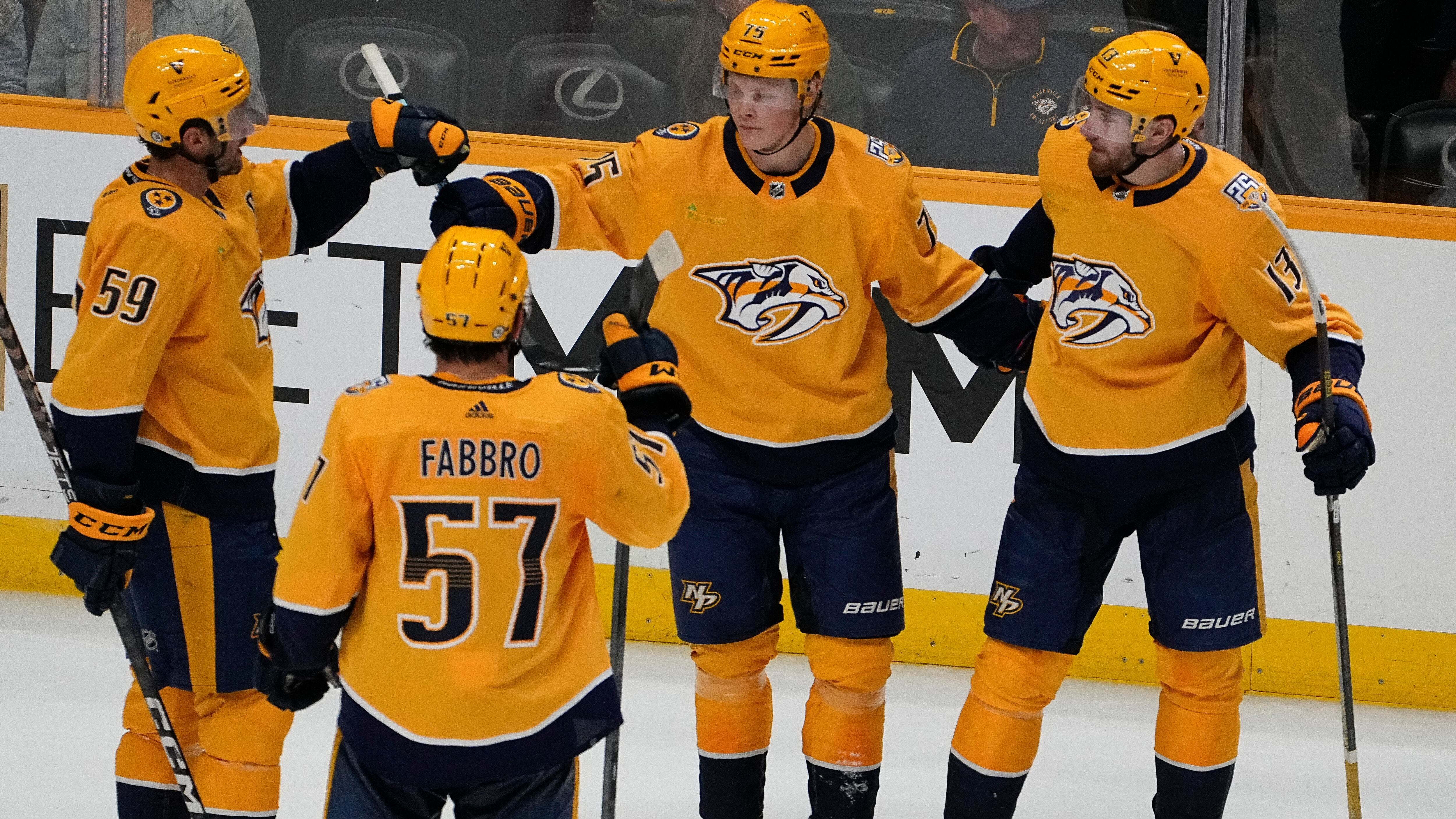 Predators defenseman Luke Schenn sat out due to a lower-body injury. He was replaced by Dante Fabbro, who was a healthy scratch Tuesday.