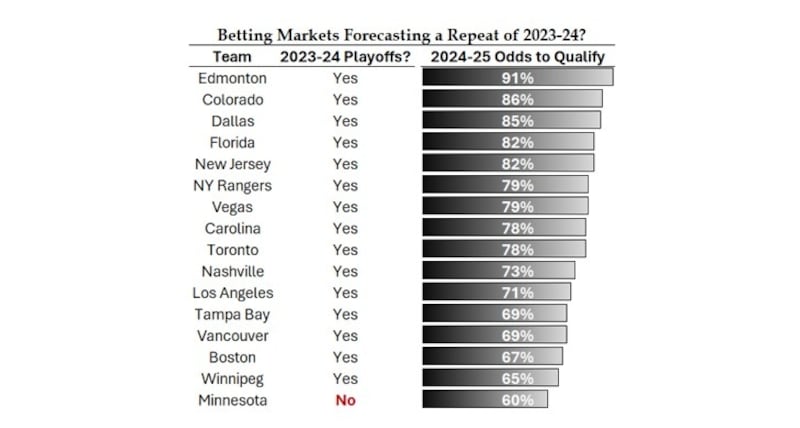 Betting markets, especially on futures, are typically looking for balanced action. But if you sort the teams by best implied probability of qualifying for the postseason, you have to get to the 16th team – the Minnesota Wild – to find a club that didn’t make it to the dance last year. (Note: the team they leapfrogged was the New York Islanders, who qualified in the East in 2023-24 with 94 points.)