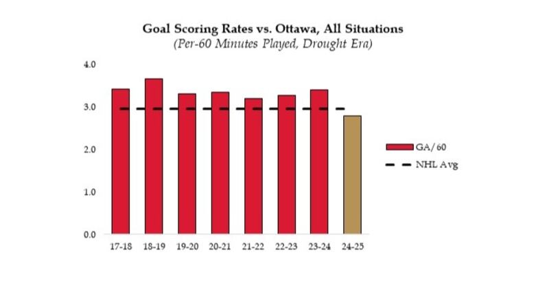 A big piece of this is the investment made to the goaltending position and Ullmark specifically, but it should not be lost on anyone that the Senators are conceding goals this season at a rate indiscernible from the Vegas Golden Knights and Minnesota Wild, historically two defensive powerhouses.