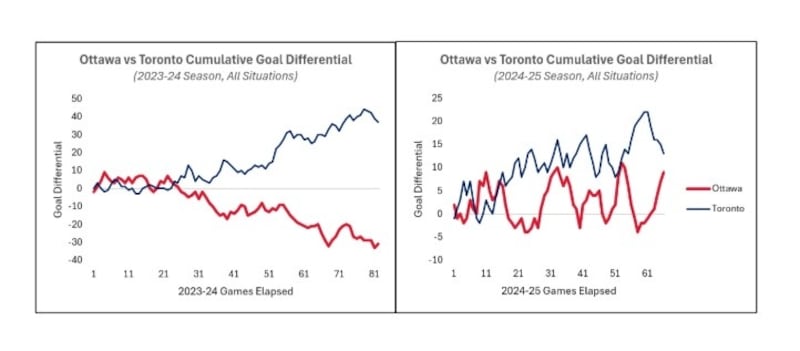 If you are looking for an indicator Ottawa has meaningfully closed the gap, look at the year-over-year change observed just within the Ontario teams. Toronto is just five goals clear of Ottawa after 66 games – a far cry from where we were 12 months ago.