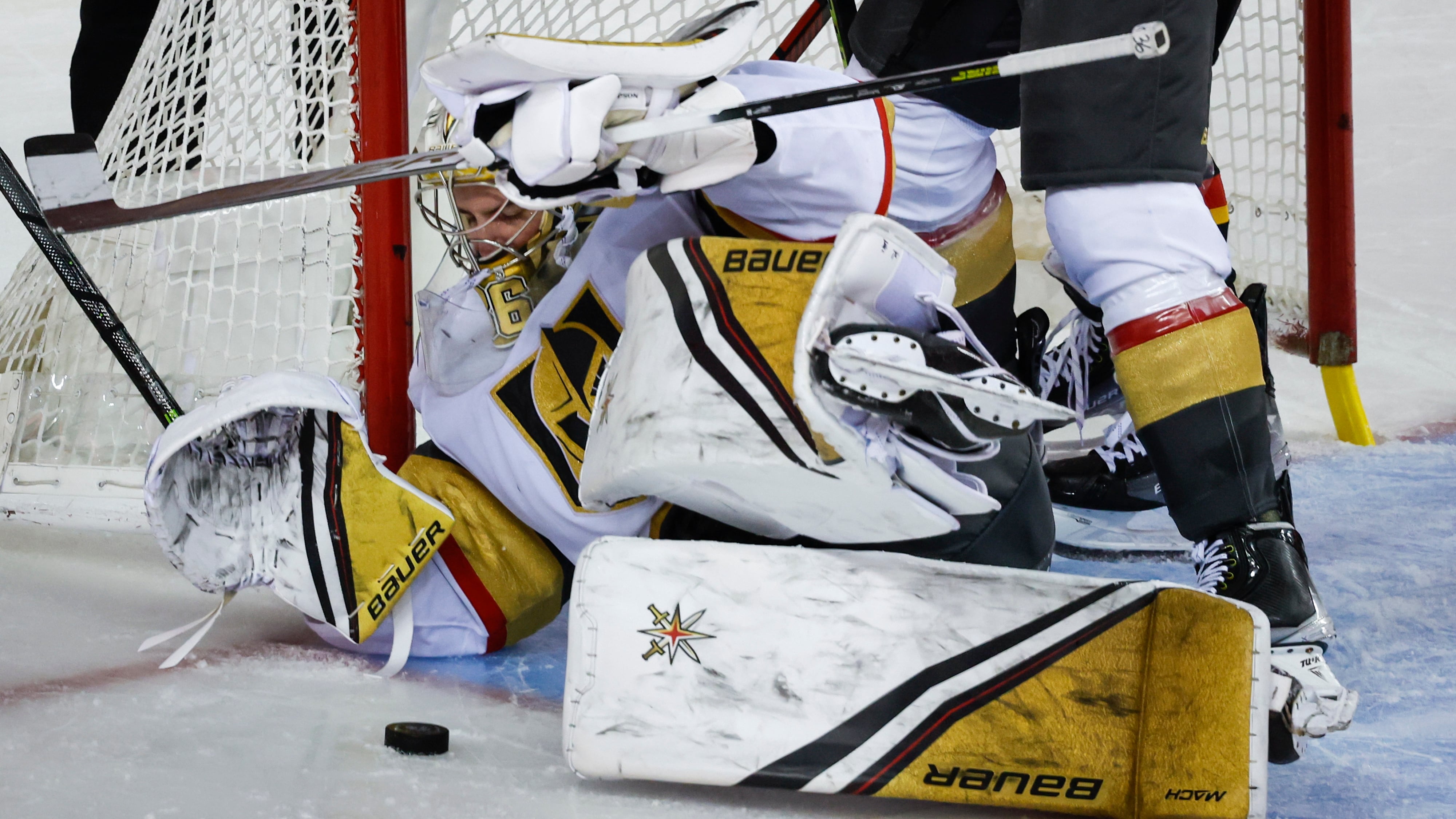 Vegas Golden Knights goaltender Logan Thompson left Thursday's win over the Calgary Flames in the third period with a lower-body injury and did not return.