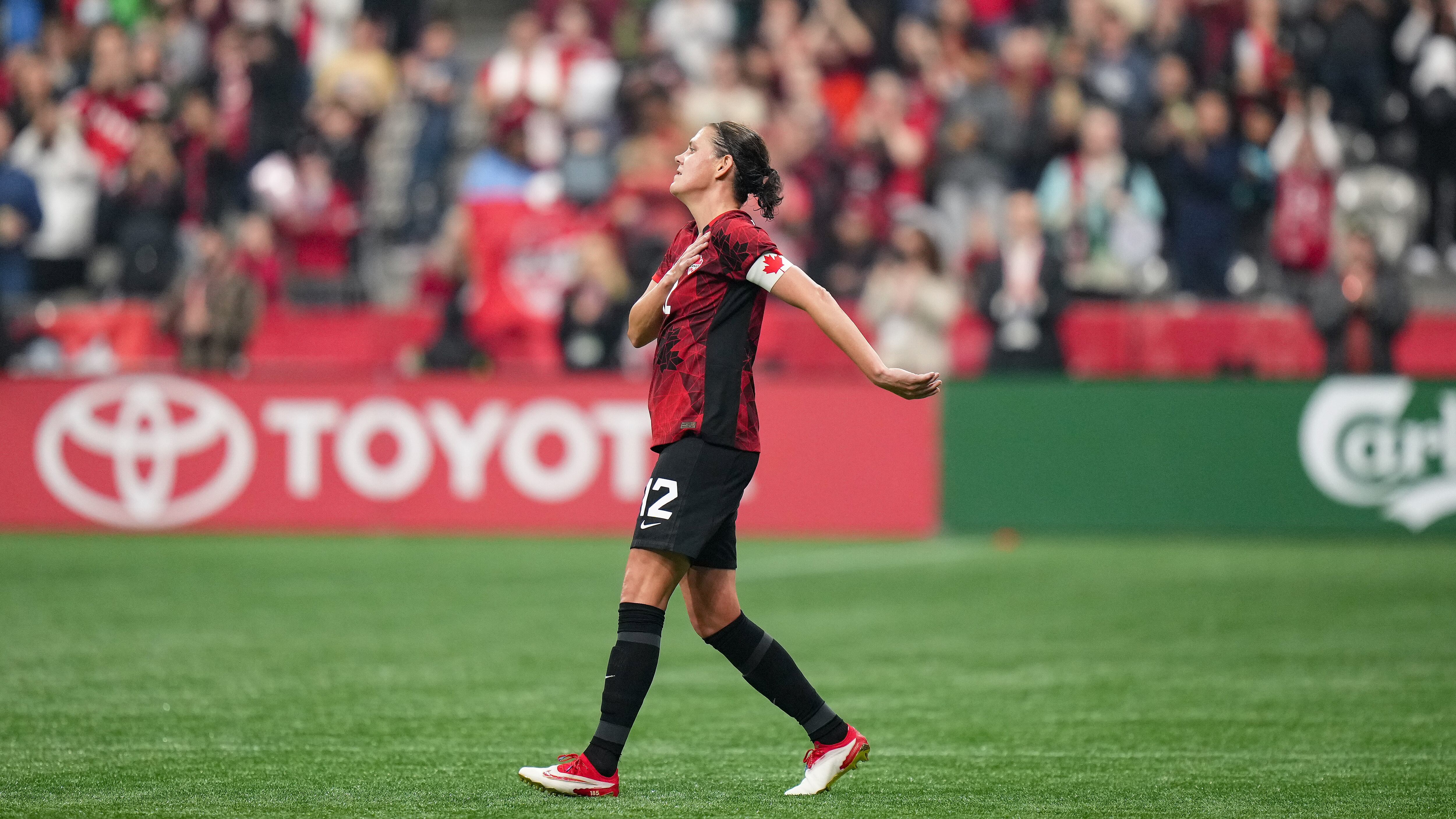 B.C. Place Stadium was renamed Christine Sinclair Place for the night, lit up with neon Canadian flags on the outside.