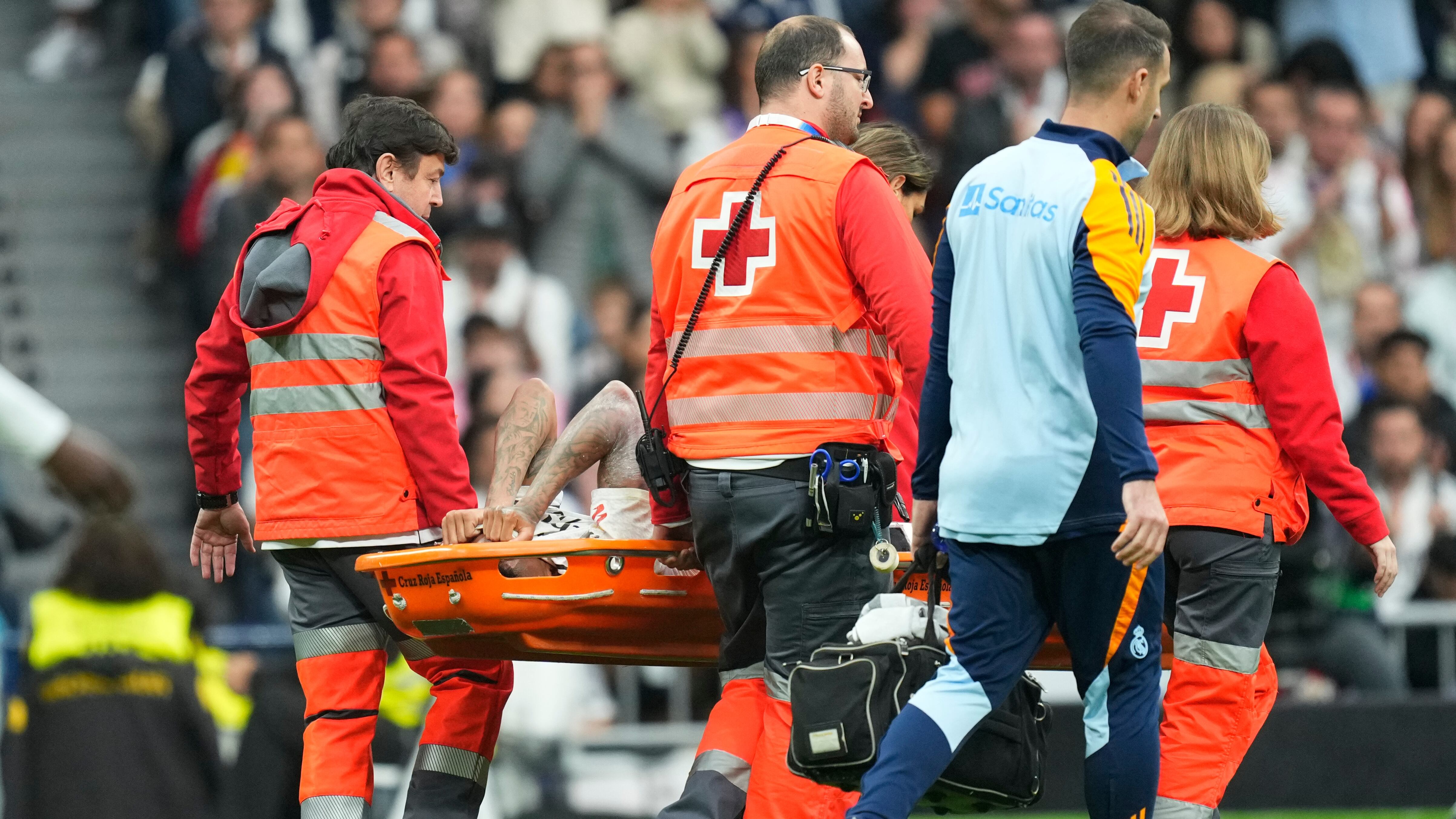 The 26-year-old Brazil center back pulled his jersey over his face as medics carried him off in the first half of the 4-0 win over Osasuna in La Liga.