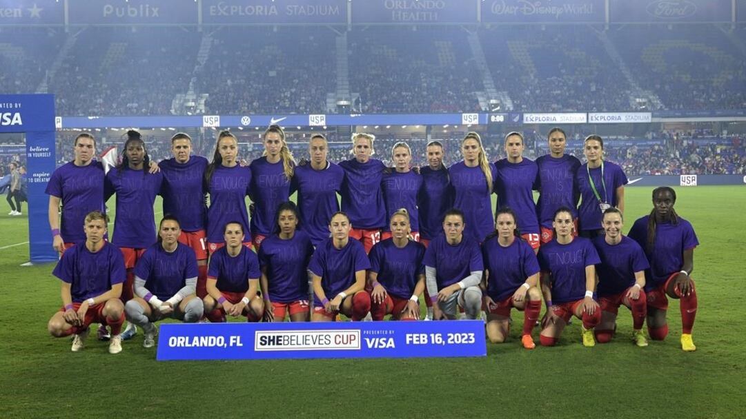 The union notes the Canadian women started the trend, symbolizing equality, to publicize their labour dispute with Canada Soccer. Ahead of the SheBelieves Cup games in February in the U.S., the Canadians also wore purple T-shirts with the words "Enough is Enough" etched on them.