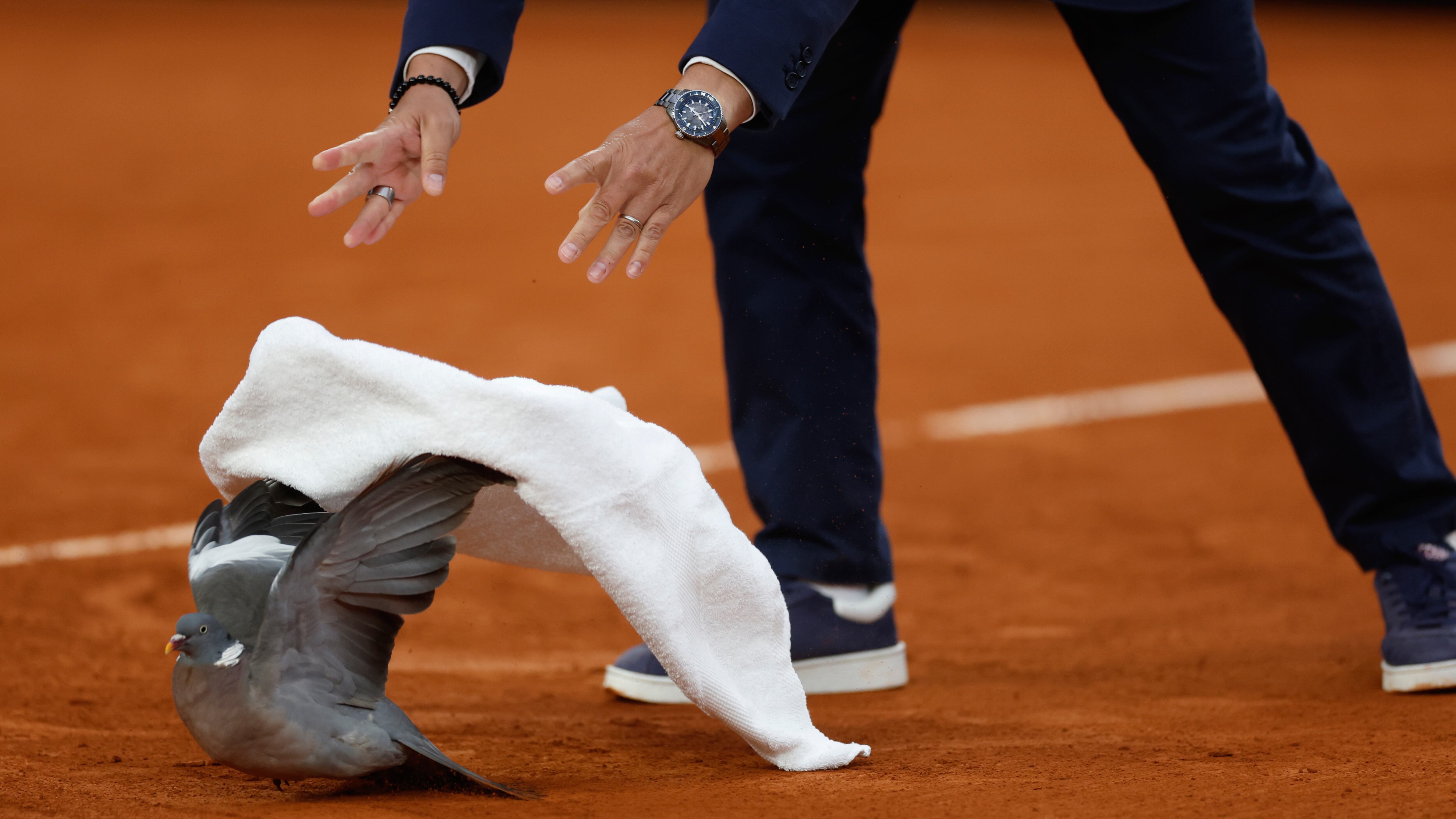 Indeed, eagle-eyed chair umpire Damien Dumusois did, um, fly into action, climbing down from his perch and grabbing a white towel. He approached the bird, which appeared injured and tried hopping away. Dumusois gave chase and eventually bent over, using the towel to grab the pigeon with both hands, earning cheers from spectators.